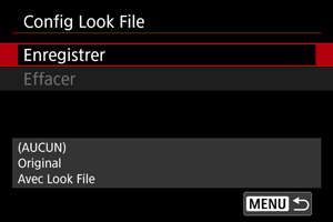 - Si vous prévoyez d'éditer un fichier d'image personnalisée et d'enregistrer un fichier Look en même temps, effectuez l'enregistrement du fichier Look en dernier.