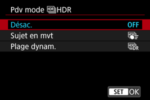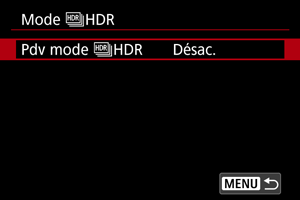 - Pour une prise de vue normale sans HDR, sélectionnez [Désac.].