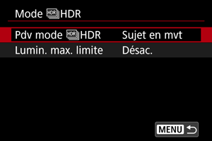 Avec [Pr chq photo], la prise de vue HDR continue jusqu'à ce que vous régliez [Pdv mode