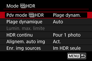 Avec [Pour 1 photo], la prise de vue HDR est automatiquement annulée après que vous mettez fin à la prise de vue.
