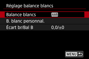 La balance des blancs (WB) sert à rendre blanches les zones blanches. Généralement, le réglage Auto [] (priorité ambiance) ou [