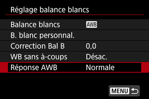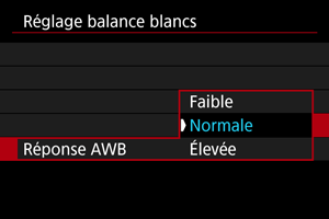 Vous pouvez sélectionner la réactivité de la balance des blancs automatique. Choisissez parmi trois niveaux de réactivité selon les conditions de prise de vue.