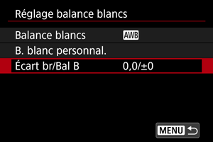 Vous pouvez rectifier la balance des blancs qui a été réglée. Ce réglage aura le même effet que l'utilisation d'un filtre de conversion de température de couleur ou d'un filtre de correction de couleur en vente dans le commerce.