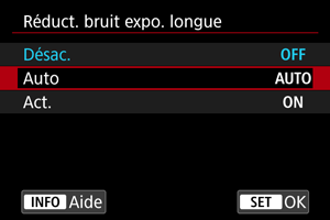 La réduction du bruit s'effectue pour toutes les images exposées une seconde ou plus. Le réglage [Act.] peut être capable de réduire le bruit impossible à détecter avec le réglage [Auto].
