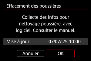 Les données d'effacement des poussières utilisées pour effacer les taches de poussière peuvent être ajoutées aux images. Les données d'effacement des poussières sont utilisées par Digital Photo Professional (logiciel EOS) pour effacer automatiquement les taches de poussière.