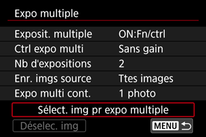 Avec [Sélect. img pr expo multiple], vous pouvez sélectionner la première exposition simple parmi les images enregistrées sur la carte (). Veuillez noter que vous ne pouvez pas fusionner plusieurs images déjà enregistrées sur la carte.