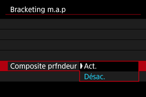 - Sélectionnez [Désac.] si vous préférez ne pas compenser les variations de luminosité des images pendant le bracketing de mise au point. Servez-vous de cette option à d'autres fins que la composition de la profondeur des images capturées dans Digital Photo Professional ().