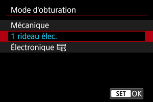 - Selon l'objectif utilisé, envisagez de photographier avec [1 rideau élec.] ou [Électronique