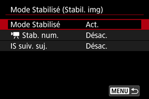 Stab. num.] est réglé sur [Act.] ou [Optimisé], [Mode Stabilisé] est également réglé sur [Act.].