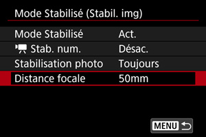 La stabilisation d'image d'après la distance focale de l'objectif que vous avez spécifiée est possible en réglant la distance focale si vous utilisez un objectif ne prenant pas en charge la communication d'objectif.