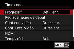 Les time codes sont ajoutés à la sortie vidéo HDMI. Avec [Act.] réglé, [Commande enreg.] s'affiche.