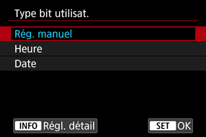 Vous pouvez ajouter les informations de votre choix (une valeur hexadécimale à 8 chiffres, l'heure ou la date) au bit utilisateur du time code.