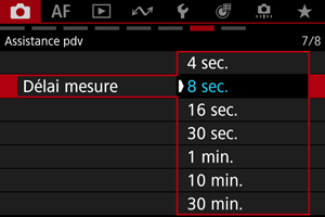 Vous pouvez régler la durée de fonctionnement du délai mesure (qui détermine la durée de l'affichage de la valeur d'exposition/mémorisation d'exposition) après qu'il a été activé par une action comme l'enfoncement du déclencheur à mi-course.