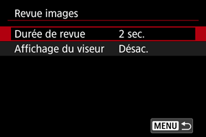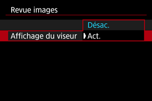 - Les réglages [Affichage du viseur] entrent en vigueur lorsque [Revue images] est réglé sur une autre option que [Désac.].