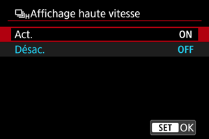 - L'affichage grande vitesse n'est pas exécuté pour des vitesses d'obturation plus lentes que 1/30 seconde, des valeurs d'ouverture supérieures à f/11, des conditions qui rendent la mise au point automatique difficile, la photographie avec flash ou l'extension de la sensibilité ISO. Il peut également s'arrêter pendant que vous photographiez.