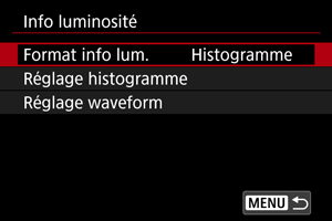 Vous pouvez régler le format des informations de luminosité (histogramme ou moniteur de forme d'onde) disponible lorsque la touche est enfoncée pendant l'attente de prise de vue.