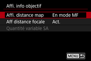 Vous pouvez afficher la distance de mise au point lorsque vous utilisez des objectifs RF ou RF-S. Dans l'affichage de la distance de mise au point, vous pouvez sélectionner le moment et l'unité de mesure.