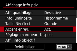 Réglez votre affichage préféré pendant l'enregistrement vidéo : [Histogramme] ou [Moniteur Wav.]. Pendant la prise de photos, seul [Histogramme] est disponible.