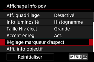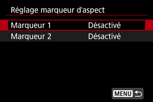 Si vous modifiez le ratio d'aspect lors de l'édition de la vidéo enregistrée, vous pouvez afficher jusqu'à deux marqueurs d'aspect sur l'écran d'enregistrement vidéo (pendant la veille et l'enregistrement) afin de connaître l'angle de champ final après l'édition.