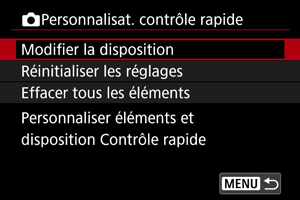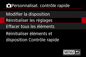 - Sélectionnez [Réinitialiser les réglages] pour rétablir les éléments et la disposition de l'écran de contrôle rapide par défaut.