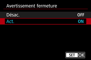 : Avertissement fermeture] sur [Désac.].