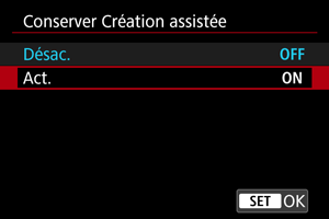 En mémorisant les réglages de création assistée utilisés dans le mode , il ne sera pas nécessaire de sélectionner de nouveau l'effet dans la prise de vue suivante.