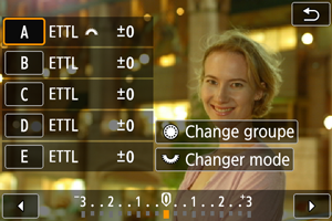 - Les réglages (mode flash et correction d'exposition au flash) de chaque groupe de flashes s'affichent.