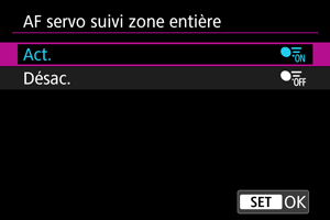 : AF servo suivi zone entière] sur [Act.] ou [Désac.] en appuyant sur la touche