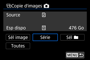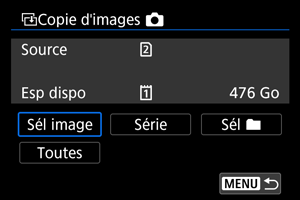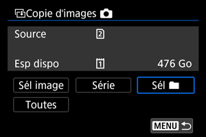 - Avec [Sél image], les images réparties dans plusieurs dossiers ne peuvent pas être copiées en même temps. Sélectionnez les images à copier dans un dossier à la fois.