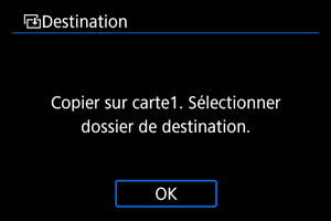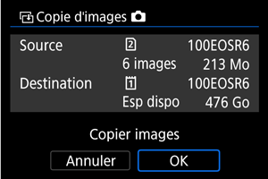 Si le dossier ou la carte cible comporte déjà une image avec le même numéro de fichier, [Sauter l'image et continuer], [Remplacer l'image existante] et [Annuler la copie] s'affichent. Sélectionnez une méthode de copie, puis appuyez sur