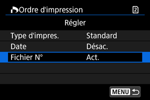 - Réglez les options [Type d'impres.], [Date], et [Fichier N°].