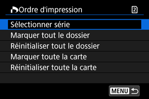 Sélectionnez [Marquer tout le dossier], puis sélectionnez le dossier. Un ordre d'impression pour un exemplaire de toutes les images dans le dossier est spécifié.