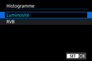L'histogramme montre les niveaux des signaux sur toute la plage tonale. L'affichage de la luminosité (pour vérifier le niveau d'exposition général et la gradation globale) et l'affichage RVB (pour vérifier la saturation et la gradation du rouge, vert et bleu) sont disponibles. Vous pouvez changer l'histogramme affiché en appuyant sur la touche lorsque [