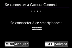 - Si Camera Connect n'est pas installé, servez-vous du smartphone pour scanner le code QR à l'écran, allez sur Google Play ou l'App Store pour installer Camera Connect, puis appuyez sur