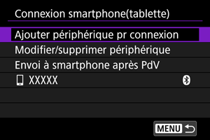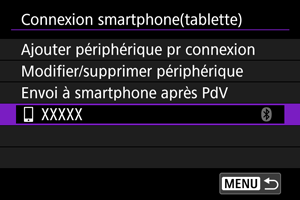 - L'appareil photo ne peut pas être connecté simultanément à deux dispositifs ou plus par liaison Bluetooth. Pour changer de smartphone pour la connexion Bluetooth, voir Reconnexion par liaison Wi-Fi/Bluetooth.