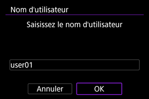 - Saisissez le nom de l'appareil photo après l'affichage de [Enregistrer un pseudo pour identifier l'appareil photo. Ce pseudo sera utilisé pour les connexions Wi-Fi et Bluetooth.].