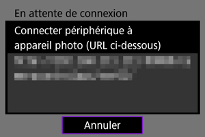 - Lorsque l'écran ci-dessus apparaît sur l'appareil photo, servez-vous du smartphone, de l'ordinateur ou d'un autre appareil pour accéder à l'URL indiquée depuis l'application développée pour le contrôle de l'appareil photo.
