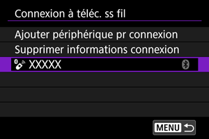 Les réglages de connexion des appareils auxquels vous vous êtes connecté par liaison Wi-Fi ou Bluetooth sont conservés sur l'appareil photo. Vous pouvez utiliser ces réglages pour vous reconnecter au même appareil.