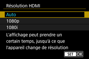 Sortie à une résolution de 1080i. Sélectionnez cette option si vous préférez éviter les problèmes d'affichage ou de retard lorsque l'appareil photo change de résolution.
