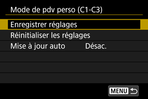 Si vous modifiez un réglage pendant la prise de vue dans le mode de prise de vue personnalisée, le mode peut être automatiquement mis à jour avec le nouveau réglage (mise à jour automatique). Pour permettre cette mise à jour automatique, réglez [Mise à jour auto] sur [Act.] à l'étape 2.
