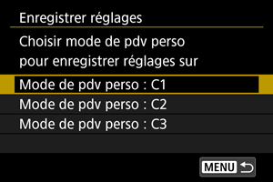 - Sélectionnez le mode de prise de vue personnalisé à enregistrer, puis sélectionnez [OK] sur l'écran [Enregistrer réglages].