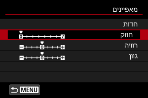 התאימו לפי הצורך. בחרו אפשרות ([חדות: חוזק], [רוויה], או [גוון]), כווננו את רמת האפקט, ולאחר מכן לחצו על .