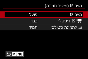 בחר [פועל תמיד] כדי לספק ייצוב תמונה קבוע. [רק לתצלום]: ייצוב התמונה פעיל רק ברגע הצילום.