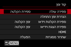 - המצלמה אינה מוסיפה קודי זמן לפלט וידאו HDMI בעת הקלטה בקצב פריימים גבוה כאשר [ספירה עולה] שב-[