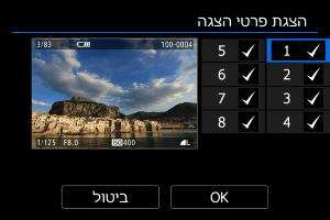 ניתן לבחור את המסכים והמידע הנלווה שיוצגו בעת צפייה בתמונות.