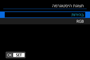 ההיסטוגרמות מציגות את התפלגות רמות האות על פני טווח הגוונים. ניתן להציג תצוגת בהירות (כדי לבדוק את רמת החשיפה הכללית וההדרגתיות הכוללת), ותצוגת RGB (לבדיקת הרוויה וההדרגתיות של אדום, ירוק וכחול). ניתן להחליף את ההיסטוגרמה המוצגת על ידי לחיצה על הלחצן כאשר [
