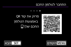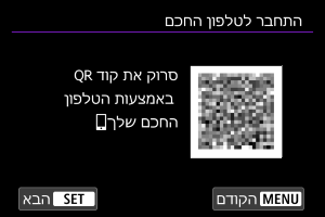 - אם Camera Connect אינה מותקנת, השתמשו בטלפון החכם שלכם כדי לסרוק את קוד ה-QR שעל המסך, עברו ל-Google Play או ל-App Store כדי להתקין את Camera Connect, ולאחר מכן לחצו על