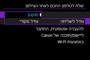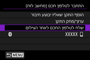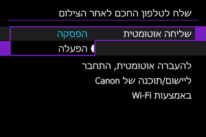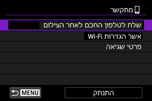 ניתן לשלוח את התמונות שלכם באופן אוטומטי לטלפון חכם. לפני ביצוע שלבים אלה, ודא שחיבור ה-Wi-Fi של המצלמה והטלפון החכם מנותקים.