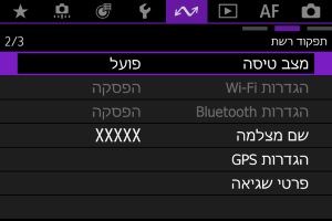 אם אתם מעדיפים להישאר מחוברים למצלמת הווידאו באמצעות Wi-Fi או Bluetooth כאשר היא כבויה, תוכלו להגדיר את [: מצב טיסה] במצב [פועל] או להגדיר את [
