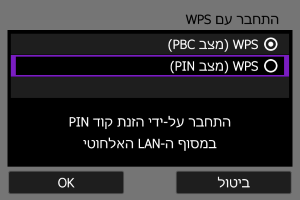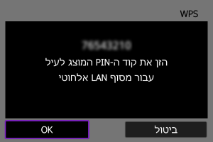 - החיבור עשוי להיות קשה יותר ישנן כמה נקודות גישה פעילות בקרבת מקום. במקרה כזה, נסו להתחבר באמצעות [WPS (מצב PIN)].